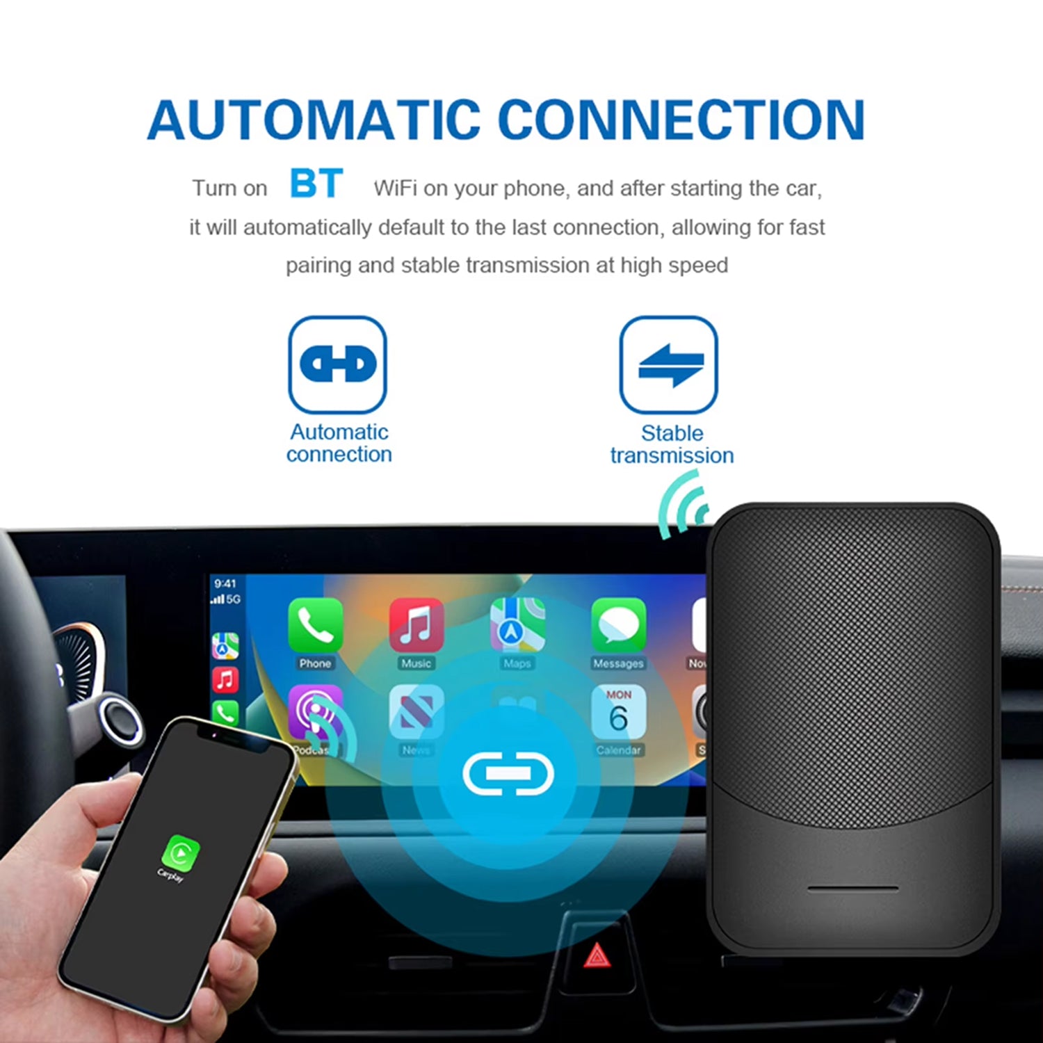 The CarviTek Car Play Adapter provides a wire-free connection, eliminating the clutter of cables and ensuring a cleaner, more organized car interior.