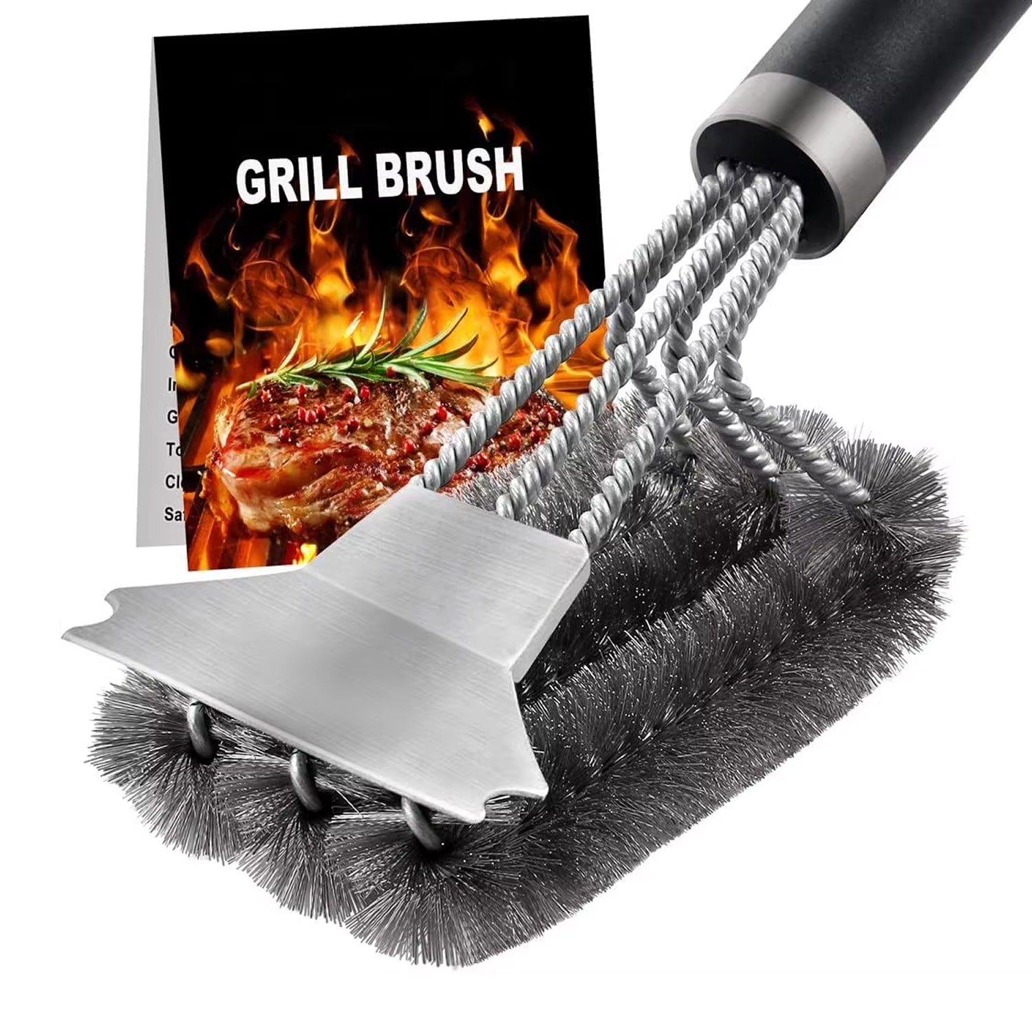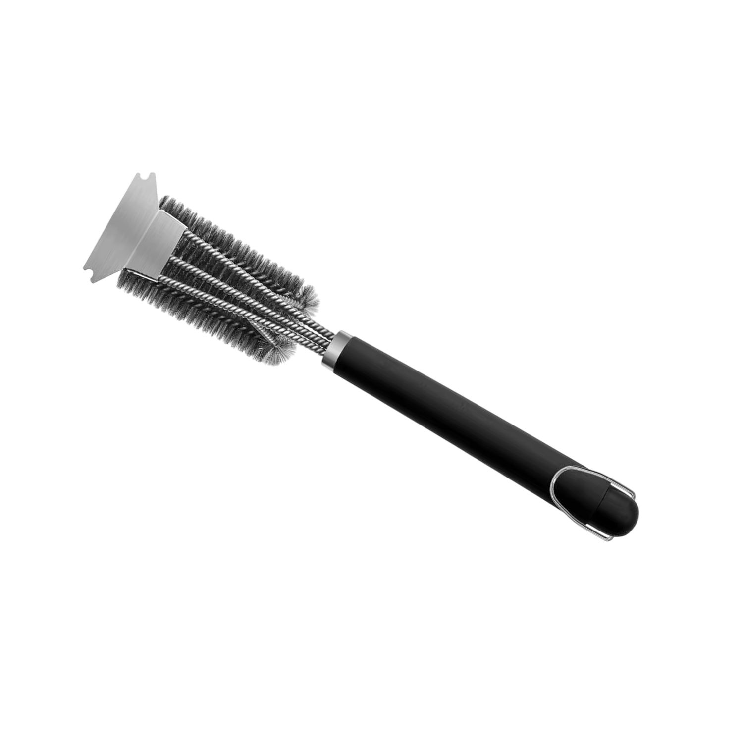The Flameorub features a specialized scraper edge and stainless steel bristles that cut through stubborn grease and char without damaging your grill surfaces. The three-brush design provides superior scraping power.