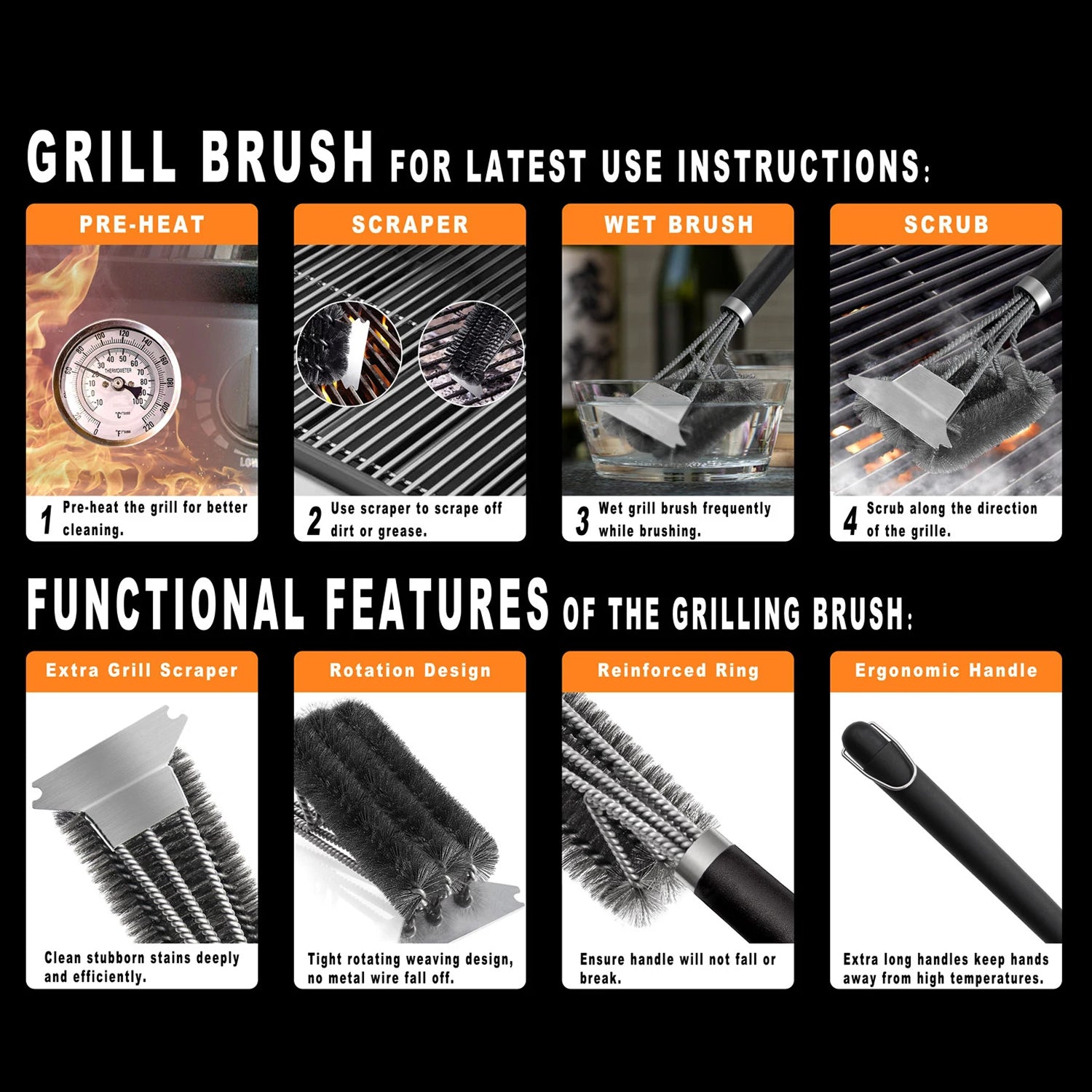 The 360-degree bristle design ensures complete coverage of all grate surfaces, reaching areas traditional brushes miss. This comprehensive cleaning approach maintains your grill’s performance and prevents flavor transfer between cooking sessions.