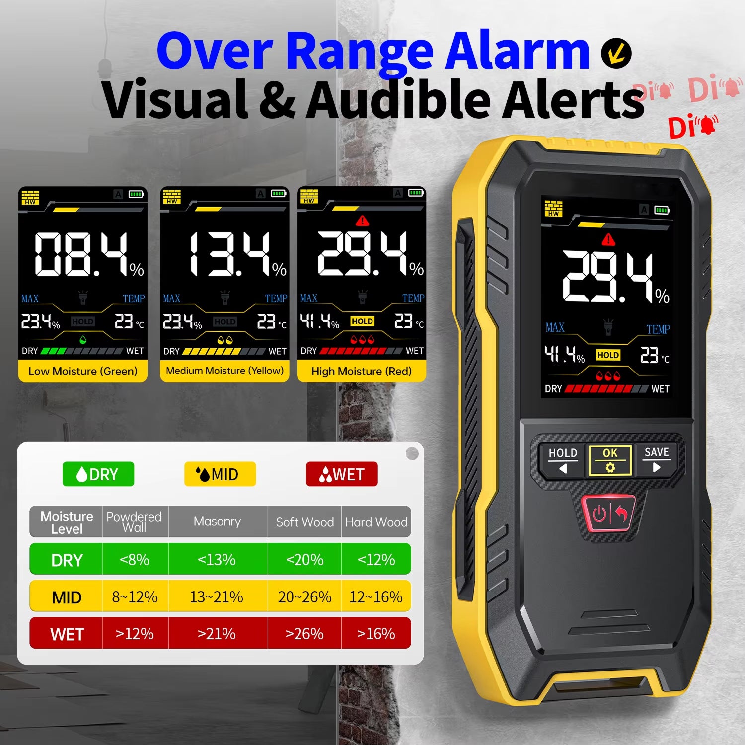 The 2.4-inch color TFT screen clearly displays measurements with color-coded moisture levels, ensuring quick interpretation of results in any lighting condition.